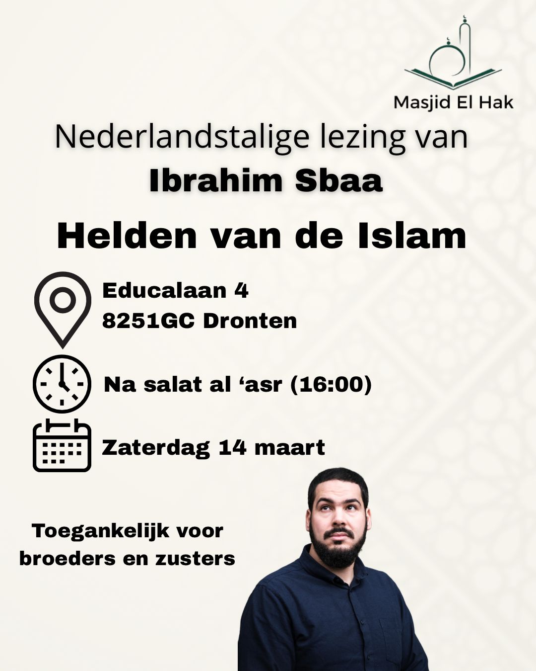 Kom naar de Nederlandstalige lezing “Helden van de Islam” door Ibrahim Sbaa.